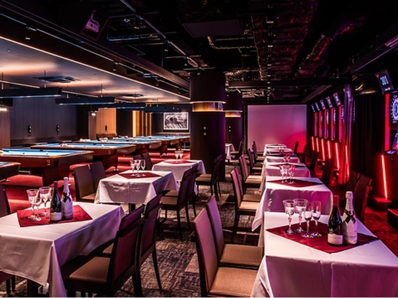 バグース 梅田店の貸切フロアは、着席70名様、立食150名様まで収容可能で、大規模なパーティーや結婚式二次会に最適な空間です。アースカラーを基調としたシックで落ち着いたデザインに、アロマディフューザーによる心地よい香りが広がり、リラックスした雰囲気を提供します。プロジェクターでの映像演出、バンド演奏、シャンパンタワーといった多彩なオプションでイベントを華やかに彩ることができ、プロジェクター、マイク、音響設備などのパーティーツールは貸切時に無料で利用可能です。ダーツやビリヤードのフリープレイ付き飲み放題プランも充実しており、エンターテイメント性も抜群。年中無休で深夜まで営業しているため、幅広いニーズに対応し、忘れられない特別なひとときを演出します。