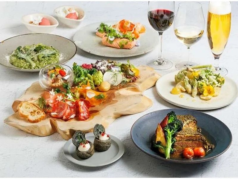 京阪本線・祇園四条駅から徒歩5分の位置にある複合施設「GOOD NATURE STATION」の中にあるレストラン。京町家の路地のような細くて長い通路を抜けると、そこに広がるのは緑豊かな空間。自然の息吹を感じる吹き抜けのテラスで、開放感溢れるひと時を過ごせる。少し落ち着いた雰囲気を求めるなら、木の温もりを感じる店内もおすすめ。あたたかみのあるライトに照らされながら料理・お酒を嗜めば、極上のひと時に。