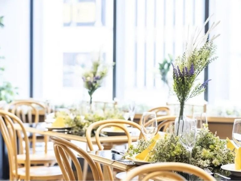 梅田駅より徒歩4分、「ホテルドンルクール」の中にあるレストラン。1Fのカフェエリアは、まるでNYにあるカフェのようなおしゃれな空間。自然光が差し込む明るい店内で、ゆったりとくつろぐことができる。2Fのダイニングホールは、ホワイトとウッド調のインテリアを基調とした洗練された雰囲気が魅力的。天井が高いため開放感があり、大人数が集まるパーティーにもぴったり。大切な仲間と一緒に、思い出に残るひとときを満喫して。