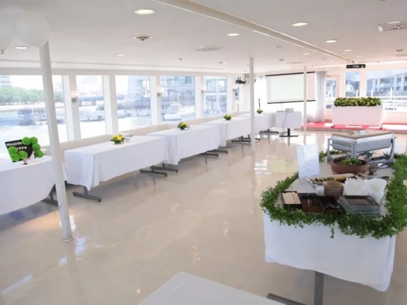 東京湾で最大級の規模を誇るクルーズ船「セレブリティ2号」。1階はゆったりとした着席スペース、2階は多目的に利用できるイベントスペースとして活用でき、2階スカイデッキでは開放的なBBQをお楽しみいただけます。さらに3階のスカイデッキからは、東京湾の壮大な360度パノラマビューを心ゆくまで満喫できます。大規模なパーティーやイベント、特別な懇親会など、あらゆるシーンで忘れられない体験を演出します。広々とした空間で、海上の非日常を存分にお楽しみください。