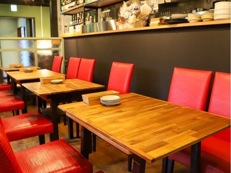 店内は都会の喧騒を忘れさせる、真っ赤な椅子とアートが印象的なおしゃれで落ち着いた空間。貸切利用も可能で、最大45名まで対応。モニターやBOSEスピーカーを使ったスポーツ観戦、Bluetoothでのお好きな音楽再生も楽しめます。半個室やソファー席もあり、電源や無料Wi-Fiも完備。